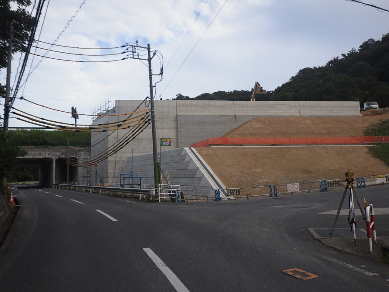 現在、A1橋台側は、市道部 盛土側の擁壁の施工を終え、付加車線の路側部に構築する擁壁を施工しています。A2橋台側については、地質調査結果に基づく基礎の修正設計を行っており、杭基礎工事を控えて、一旦施工を休止しております。